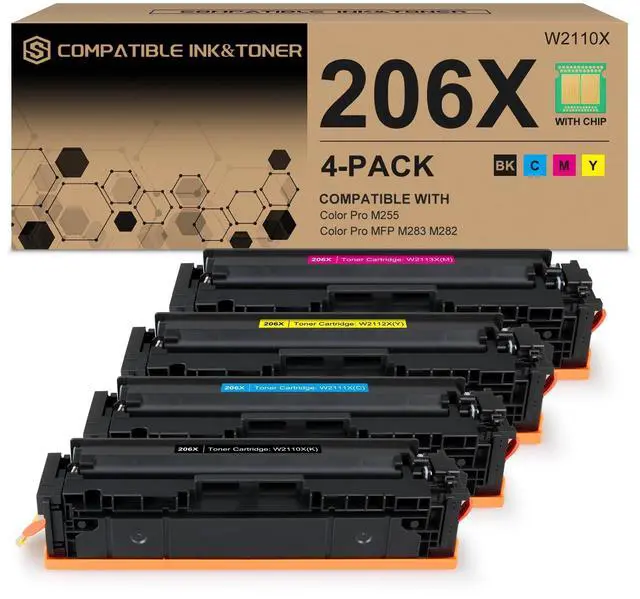 What's in the box: 4 packs of 206X toner cartridges with chip (1 x 206X W2110X black toner, 1 x 206X W2111X cyan toner, 1 x 206X W2112X yellow toner, 1 x 206X W2113X magenta toner) compatible with HP MFP M283fdw M255dw toner.