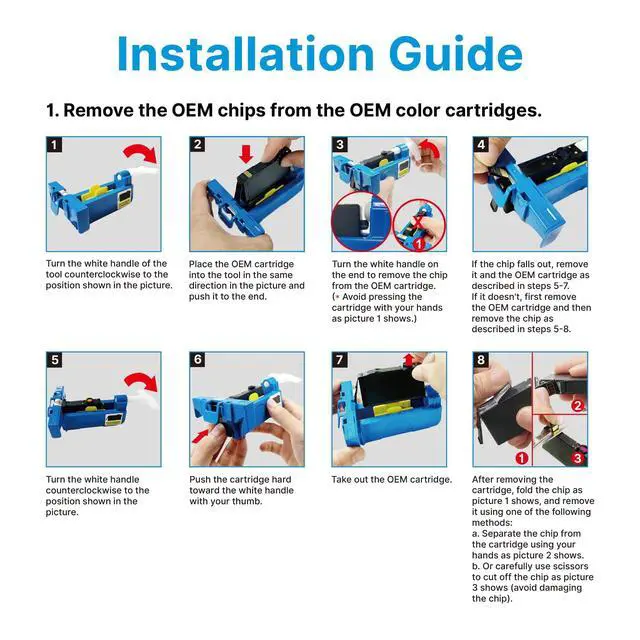 High Page Yield: Up to 500 Pages per Black for HP 923 Ink Cartridges and 400 Pages per Cyan Magenta Yellow 923 Ink Cartridges for HP Printers (At 5% Coverage for A4 Paper) ^^ Wiseta for HP 923 Ink Cartridges Chip Replacement Guide Remove Original Chip: Detach the old chip from cartridge using the provided tool Install