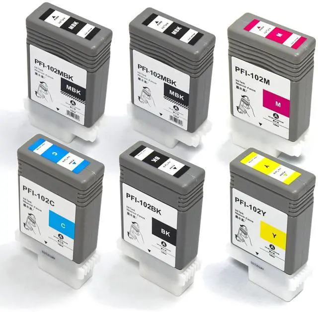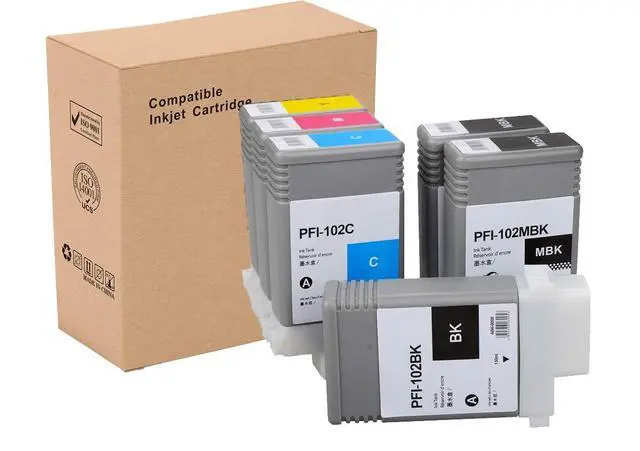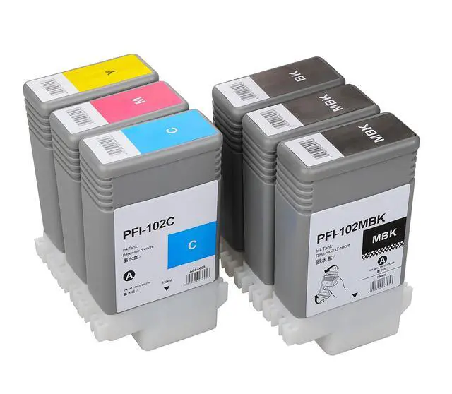 INK+ Be Your Ink ExpertWe are an integrated factory specializing in the production and sales of printing consumables with 6 years of experience. We attach great importance to the quality of our products, and always take customer experience as the first standard. Please feel free to share your experience with us. PFI102 6 Pack Pigment Ink CartridgesWhat is included in the packagingTotal 6 Pack Pigment Ink Cartridges (2MBK, 1BK, 1C, 1M, 1Y); The Capacity is 130ML per