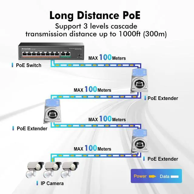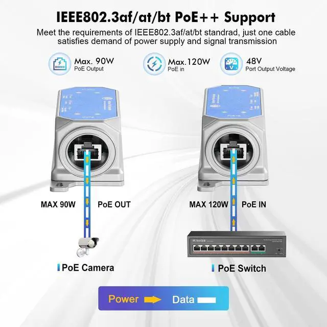 2 Gigabit PoE Ports: Include 1 PoE In, 1 PoE Out, 10/100/1000Mbps speed. 100BASE-TX, Cat5 or later UTP(150 meter); 1000BASE-TX: Cat6 or later UTP(100 meter)