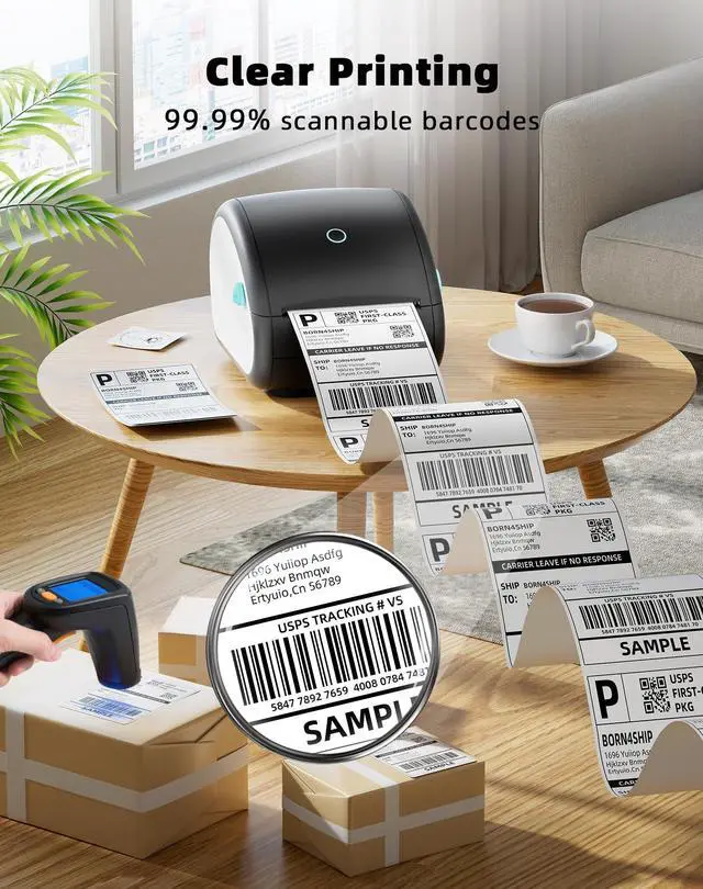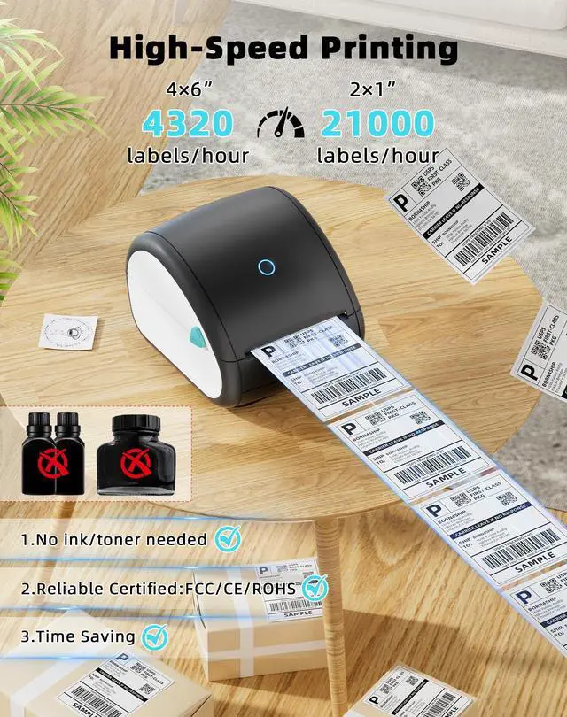 Shipping thermal label printer: Bluetooth label printer use thermal printing technology have 203 DPI resolution, print speed of 150mm/s, can print 72 4x6 labels per minute, which eliminates the need for no-ink, toner, or ribbon, simplifying the tedious installation process and eliminating blockages & cleaning issues. Use this thermal printer efficient printing saves you time significantly improves work efficiency, Recommend: using our thermal paper for good print quality.