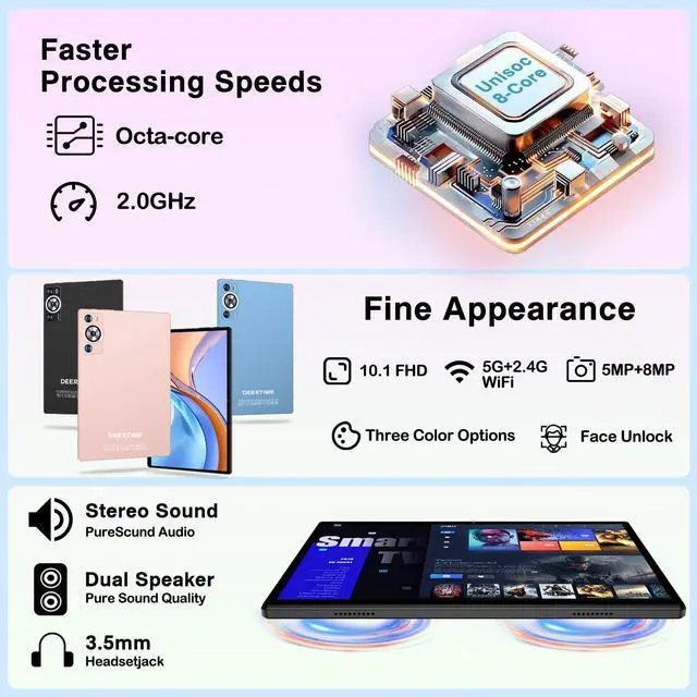 DUAL CAMERA: The tablet includes a 5MP front camera and an 8MP rear camera, ideal for taking photos or video calls. It also supports GPS, dual speakers, Bluetooth 5.0 and 2.4G /5G Wi-Fi, providing fast and stable connectivity on the go