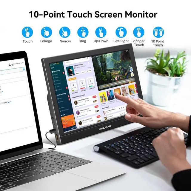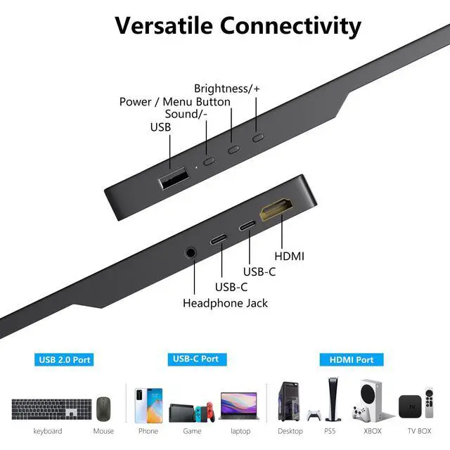 ^^ Wide Compatibility: The portable external USB C portable monitor has dual USB-C, HDMI, and a dedicated USB-A port. You can connect it to a variety of devices, including laptops, desktops, gaming consoles, and mobile phones. It's truly plug-and-play, supporting extended, mirrored, and second monitor modes right out of the box. ^^ Portable & Ultra-Slim