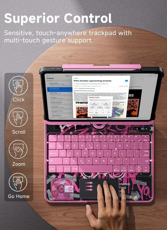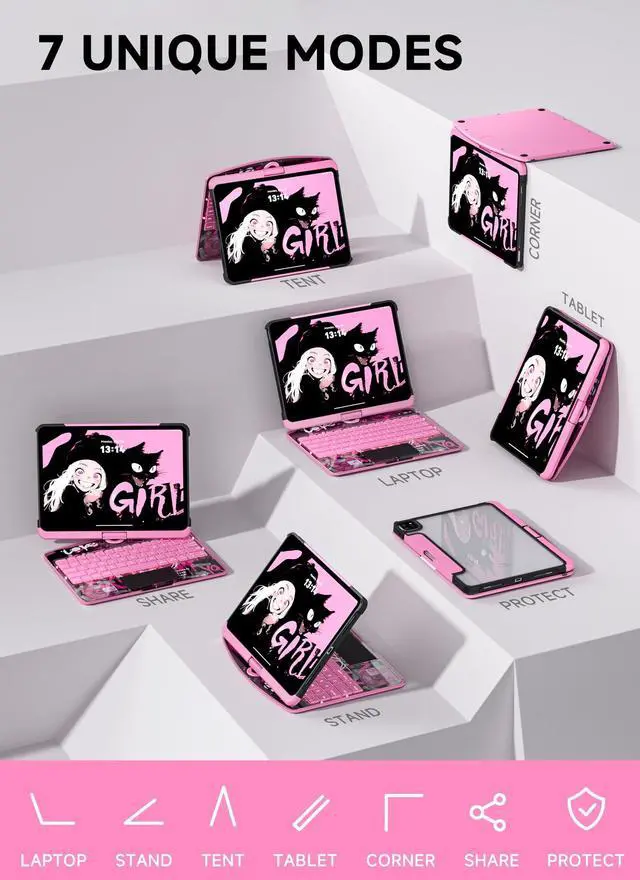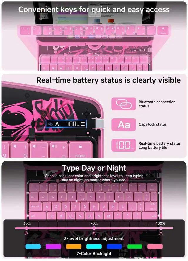LCD Power Display: The integrated LCD power display shows battery status at a glance, helping you stay informed throughout the day. A 7-color backlit keyboard with 3 brightness levels ensures comfortable typing in any lighting, while 14 iPadOS shortcut keys offer quick, one-touch access to volume, brightness, and media controls. ^^ Crystal-Clear Design with