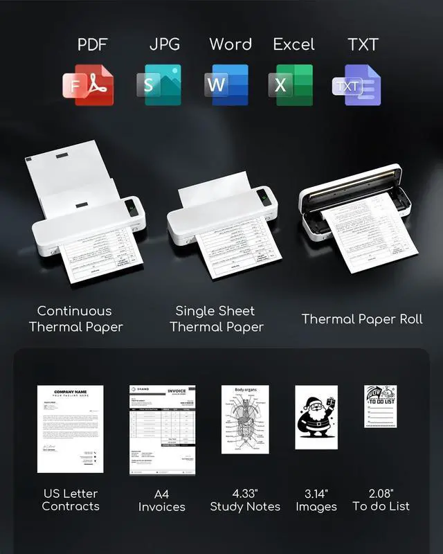 Printing]: The wireless portable printer with built-in paper bin, support thermal roll paper, continuous and single sheet thermal paper. This small wireless printer also supports 5 sizes of thermal paper: 8.5 X 11 US Letter, A4, 4.33 '' (110mm), 3.14 '' (80mm), 2.08 '' (53mm) width thermal paper, can meet most of your needs ^^ Wireless Bluetooth Printer [Strong