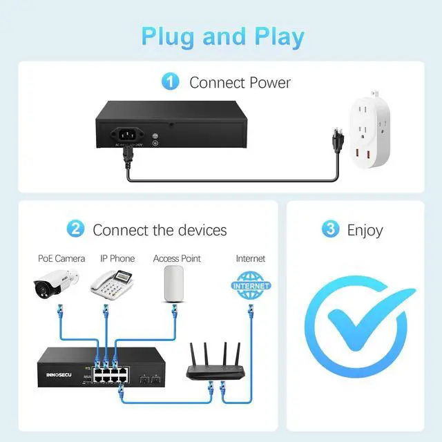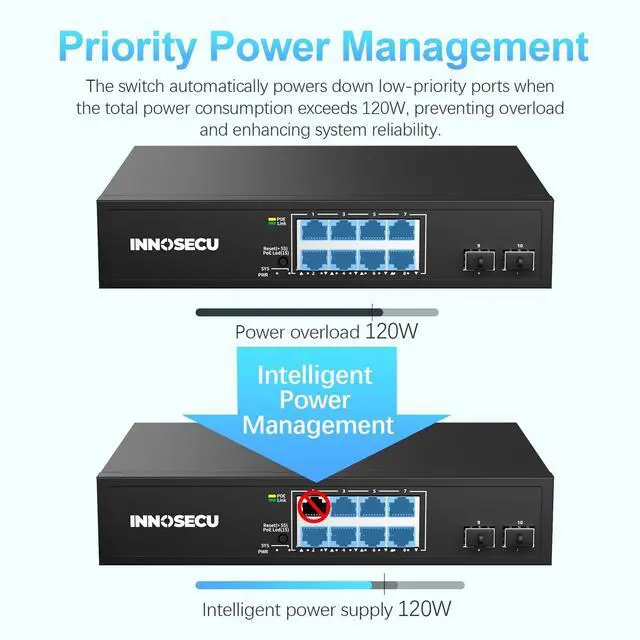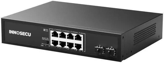 Power Delivery: This switch features 8 PoE-enabled ports (10/100/1000Mbps), and 2 Gigabit SFP uplink ports (10/100/1000Mbps). Compliant with IEEE 802.3 af/at standards, it delivers up to 30W per PoE port with a total power budget of 120W, capable of powering 8 PoE devices simultaneously.