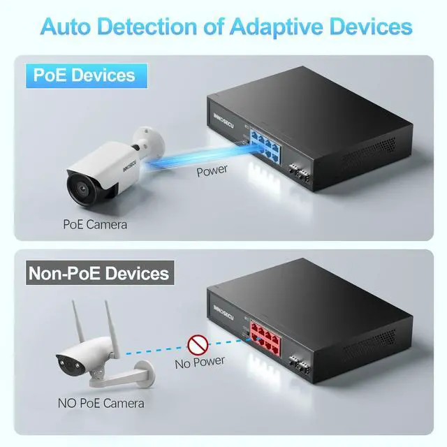 Auto PD Detection: Intelligently identifies connected PoE devices (PDs) and only supplies power to IEEE-compliant terminals, preventing potential damage to non-PoE equipment.