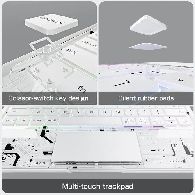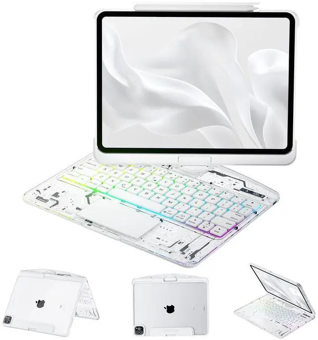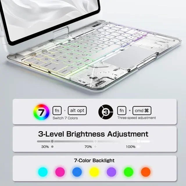 ^^ 7-Color Backlit Keyboard: This keyboard for iPad pro 13 inch features a dynamic 7-color RGB backlit keyboard with three adjustable brightness levels and silent tactile keys. The iPad pro 13 inch case keyboard allows you to personalize your typing with a spectrum of colors and optimal brightness for any environment, while the whisper-quiet silent keys ensure distraction-free use in meetings, libraries, or late-night sessions, combining vibrant customization with serene productivity.