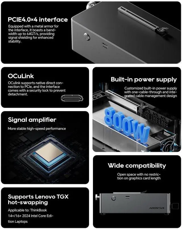 Note: This external GPU dock is only compatible with devices with an Oculink port. Please check in advance. ^^ OCuLink and TGXOCuLink interface provides 64Gbps effective bandwidth in PCIe 4.0 x4 lanes and the base is hot-swappable 2024 Lenovo ThinkBook 14+ / 16+ Core Edition Laptop TGX Interface For interface. ^^ AG01 EGPU dock specifications