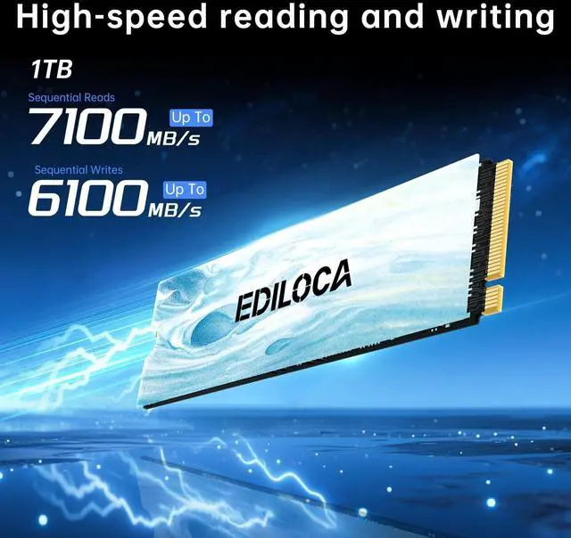 Top Performance]: Ediloca EN880E M. 2 SSD 1TB adopts NVMe protocol and PCIe Gen 4x4 specifications, and the maximum read and write speed can easily reach 7100MB/s and 6100MB/s. With lightning-fast speeds, the EN880E NVMe SSD can make your computer's systems and applications respond quickly, improving work efficiency.