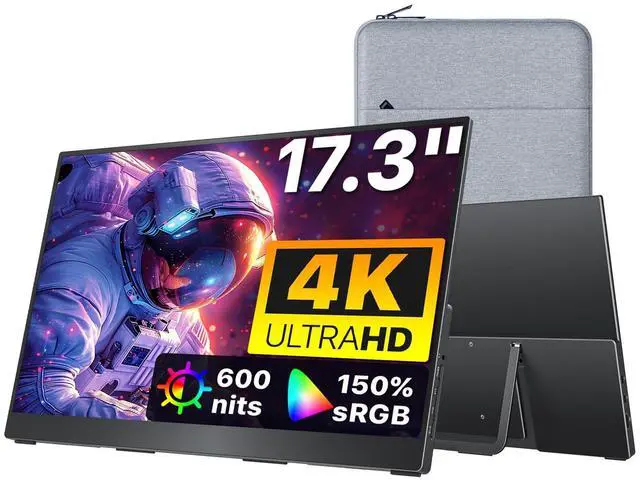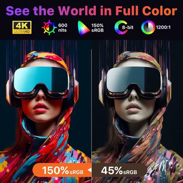 Color Performance: The cocopar 17.3 inch portable monitor delivers stunning 4K 38402160 resolution with 1200:1 contrast ratio, presenting sharp details and vivid layered images. Boasting 150%sRGB wide color gamut, 8-bit color depth and 16.77M colors, the portable display ensures accurate color reproduction, perfect for photo editing, video production and color-critical tasks as a second monitor for laptop. It offers single USB-C cable portability (up to 500 nits) and peak performance (up to 600 nits with included power adapter).