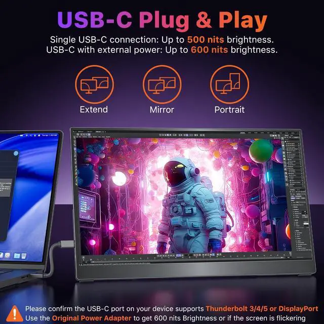 NOTE: Your device should support thunderbolt 3/4/5 or USB 3.1 Type C DP ALT-MODE ^^ Ultra Lightweight & Travel Ready Design: This travel monitor weighs only 1.7 lbs, making it incredibly easy to slip into your backpack. A custom cloth bag is included in the package to protect the portable monitor from scratches and bumps during transit, ideal for frequent travelers and mobile professionals. Equipped with dual stereo speakers, this portable monitor delivers clear, immersive audio for video conferencing, movie watching, and gaming ^^ Premium Aluminum Build & Built-in Kickstand: Engineered for durability and style, this portable monitor for laptop is crafted from high-grade aluminum alloy for superior heat dissipation and impact resistance. The innovative built-in stand supports multiple viewing angles, while the 4 VESA holes on the back offer effortless mounting for a permanent desktop setup. Its the perfect blend of structural integrity and modern aesthetics