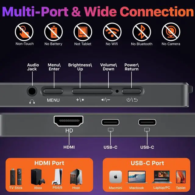 Play: This versatile portable monitor features dual USB-C ports and one HDMI port for instant connection to laptops and gaming consoles. Whether you need an external monitor for MacBook or a portable gaming screen, this plug-and-play display ensures a stable, high-speed connection for all your devices. No driver or software needed.