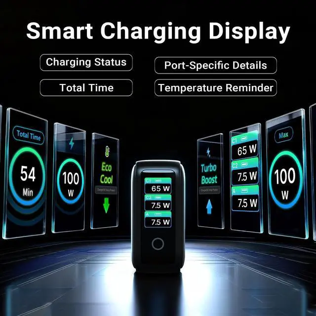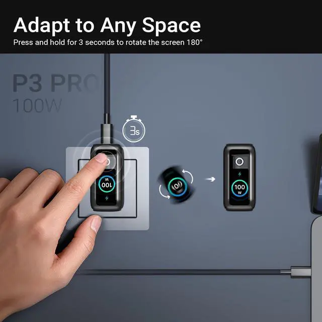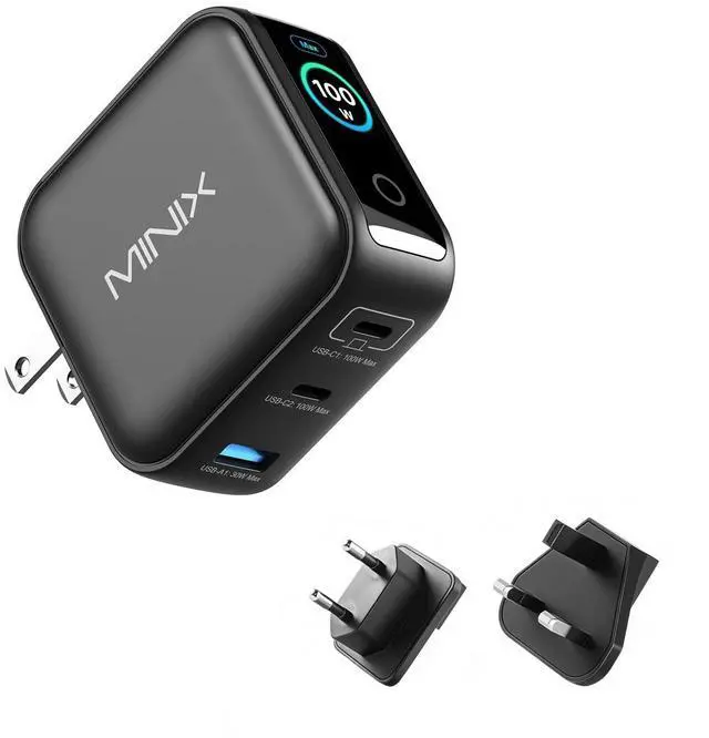 100W GaN Fast Charging With 100W Max output, this GaN charger provides rapid charging across USB-C and USB-A ports, powering your MacBook Air to 50% in just 30 minutes. Advanced GaN tech ensures ultra-efficient, high-speed power for all your devices, ideal for traveller and professionals. ^^ Smart Display for Real-Time Insights MINIX P3 PRO smart display rotates to 180with a simple 3 Seconds press and provides real-time details on charging status, temperature, and port performance, ensuring safe and efficient charging at all times. ^^ Compact & Stable Wall Plug This 3-port (2xUSB-C, 1xUSB-A) wall charger features a foldable plug, paired with intelligent power redistribution and a lightweight design for reliable, travel-ready charging.