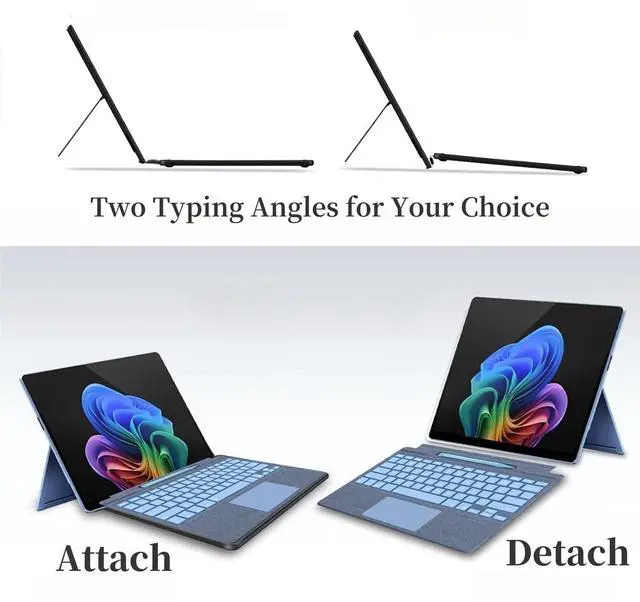 Notice: This surface pro keyboard's pen slot only for storage, not for charging. (PEN IS NOT INCLUDED, ONLY FIT Slim Pen 2 / Slim Pen). ^^ Adjustable AngleYou can adjust your microsoft keyboard at different angles for more comfortable typing and viewing. surface pro keyboard can detach or attach a more ergonomic typing angle through magnetic adsorption.