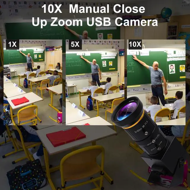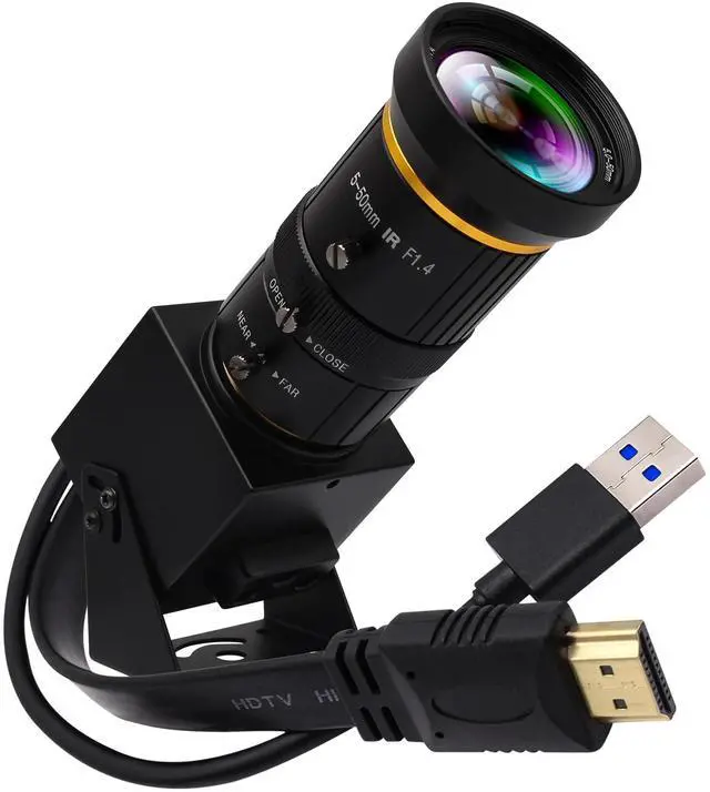 Simultaneous Output: USB Type-C power supply, connect USB cable to PC, HDMI cable to TV displayer with HDMI port. TV & PC display at same time. ^^ 5-50mm 10X manual focus and zoom lens enable 2X digital zoom and 10X optic zoom total 10X zoom for super clear details images. Which can achieve ultra HD 3840x2160 60FPS video output. ^^ With New Video format, can achieve up to 50% more compression than H. 264, which means that it can transmit the same quality video using less bandwidth or storage. H. 264/MJPEG/YUY2 optional, can drive 3840x2160 MJPEG 60fps/ H. 264 60fps. ^^ Good zoom in and out camera suitable for the research, technical or hobby projects, Raspberry Pi project to record bird feeding, the bird feeder, keep the recording in loop, especially getting a satisfactory long distance focus outdoors. ^^ UVC Compliant Plug&Play - just connect the camera to PC computer, laptop, Android device or Raspberry Pi with theUSB cable without extra drivers to be installed or with HDMI cable to motitor for display directly. ^^ 4K 5-50mm 10X Manual Optical Zoom LensThis HDMI 4K ultra-HD USB 3.0 camera features a 1/ 2.8" CMOS IMX415 color image sensor with a 10x manual optical zoom lens (5-50mm).