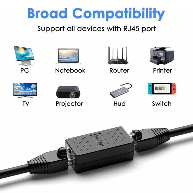 RJ45 coupler is helpful for extending ethernet connection by connecting 2 short network cables together ^^ This 8P8C female to female ethernet coupler jack is compatible with Cat7, Cat6, Cat5e, Cat5 network ^^ RJ45 inline jack coupler meets category 6 performance in compliance with the TIA/EIA 568-C. 2 standard; It is RoHS compliant ^^
