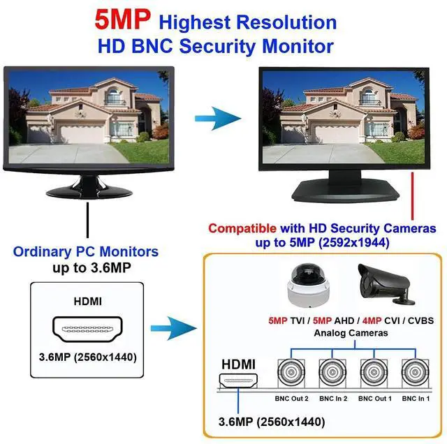 1. 23.6" Super HD 5MP/2592x1944 over Coax LED Security Monitor. 1 HDMI & 2 Super HD BNC Video Inputs. BNC video-in port works directly with the new Super HD security cameras without going through any DVR or converters. It will allow security cameras send clear video by using a single Coax cable to the HD monitor, and it can prevent fuzzy or unclear images between the camera, recorder, and monitor. And 2 BNC Video Outputs for Second Monitor. Comprehensive range of Super High Definition product line, including cameras, DVRs/NVRs, and Super HD monitors.