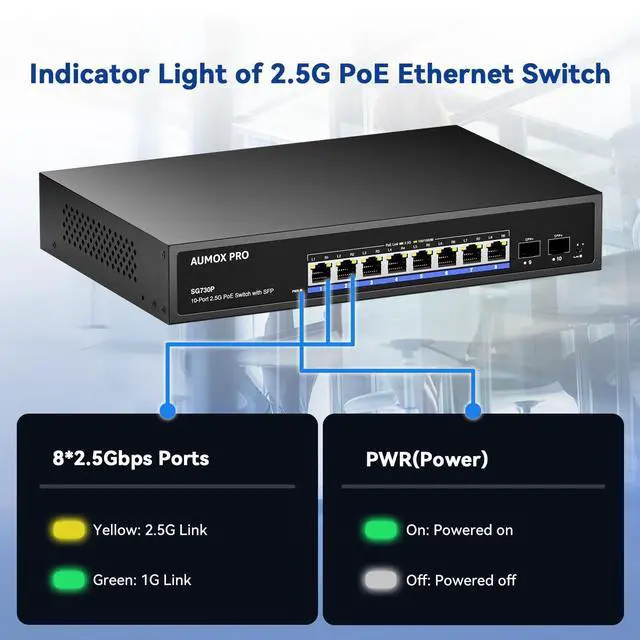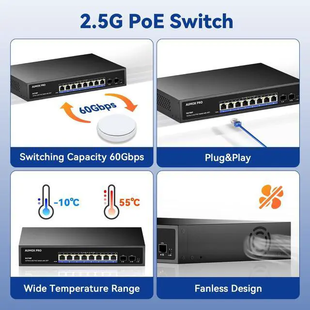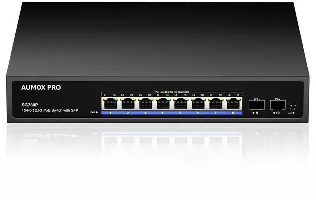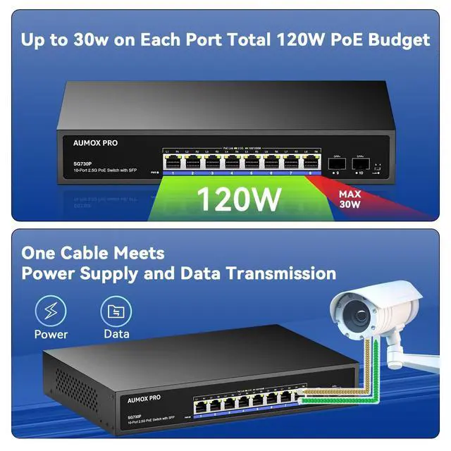2.5G Port, Superior Performance8 2.5 -Gigabit ports unlock the highest performance of your Multi-Gig bandwidth and devices, and provide up to 60 Gbps of switching capacity. And 2*100/ 1000/ 2500/ 10000 Mbps SFP slots, all ports support wire-speed forwarding, capable for high-speed network requirements ^^ 120W poe switchAUMOX PRO 2.5 gb poe network switch equipped with 8 802.3 af/at PoE ports with up to 30W for each port, data, and power can be transferred on one single cable. It supports PoE power up to 120W for all PoE ports ^^ Easy to