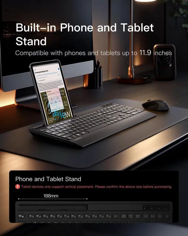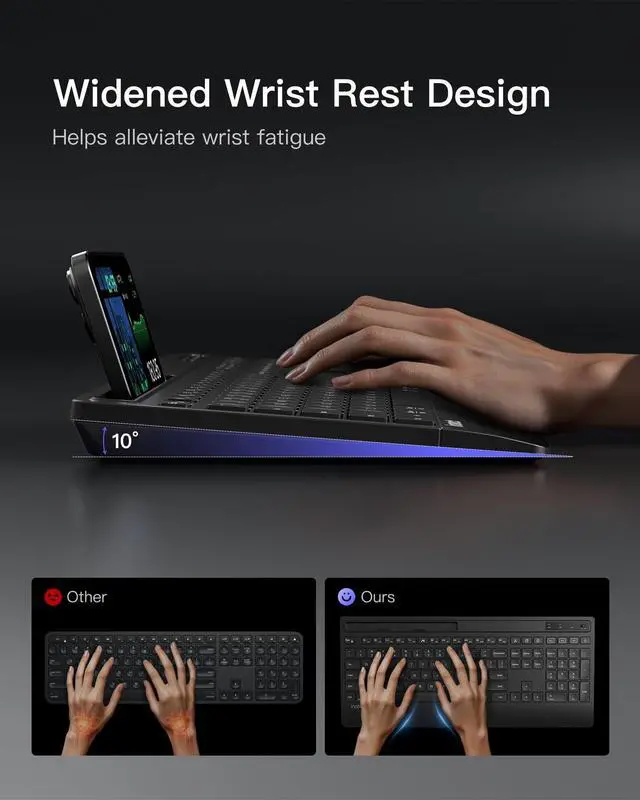 Full-Size Ergonomic Keyboard: Features a built-in stand for stable support of phones or tablets, a widened wrist rest to reduce fatigue, and an adjustable tilt design. Ideal for checking emails, editing documents, or watching videosenhancing both productivity and entertainment ^^ Multiple