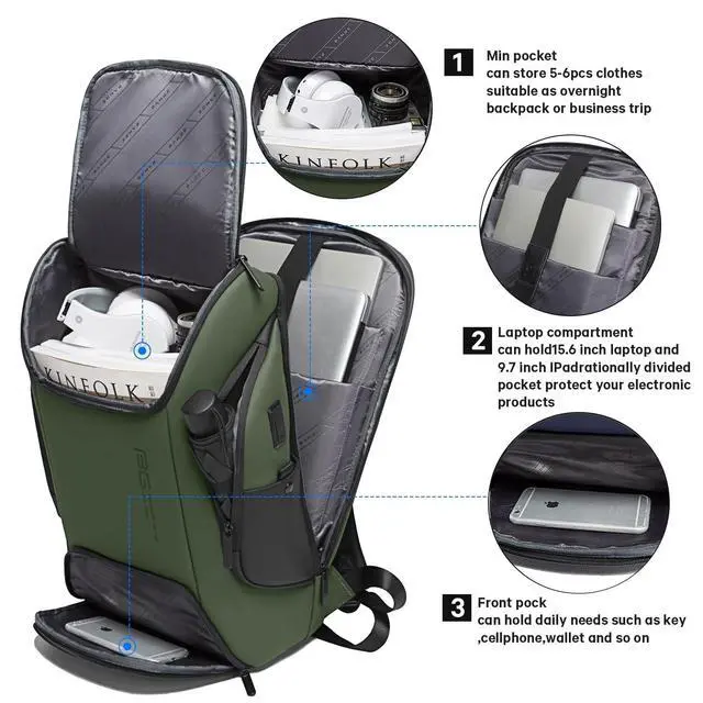 Multi-function pocket: The front pocket can hold daily needs such as key, cellphone, wallet and so on, the main pocket can contain 5-6pcs clothes suitable as overnight backpack or business trip bag, Laptop compartment can hold 15.6 inch laptop and 9.7 inch IPad, rationally divided pocket protect your electronic products, Two side pocket can hold your power bank, umbrella, bottle etc ^^