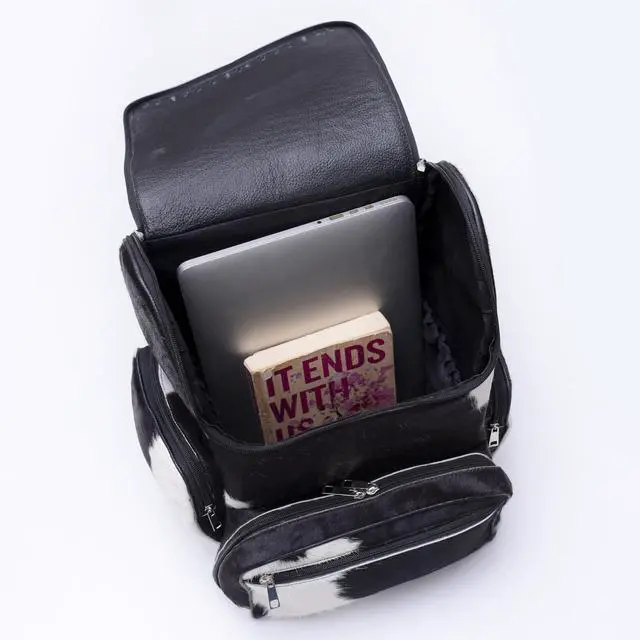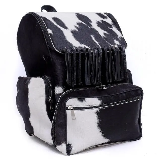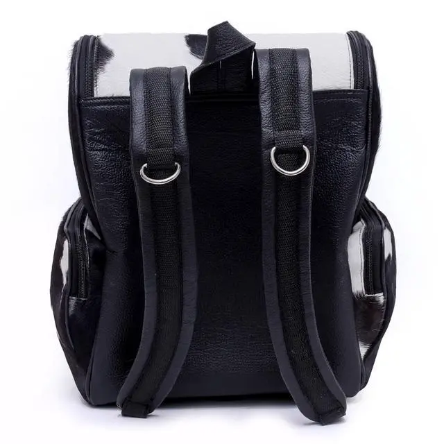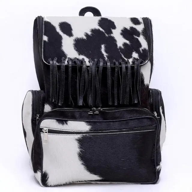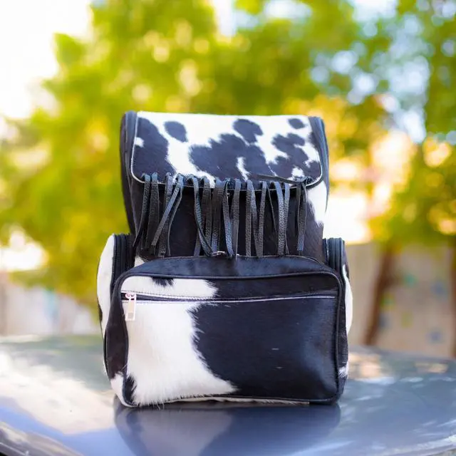 DescriptionExperience the blend of Western style and everyday functionality with this handcrafted cowhide backpack. Made from full-grain, hair-on genuine cowhide, each bag showcases natural pattern variations that make every piece visually unique. Designed for daily use, travel, or parent duty, this backpack offers durability, organization, and a distinctive look. The spacious interior includes a section suitable for carrying devices up to 15 inches, along with multiple pockets for organizing essentials such as diapers, accessories, travel items, or personal belongings. Adjustable straps provide comfort for long wear, while secure zipper closures help keep items protected.