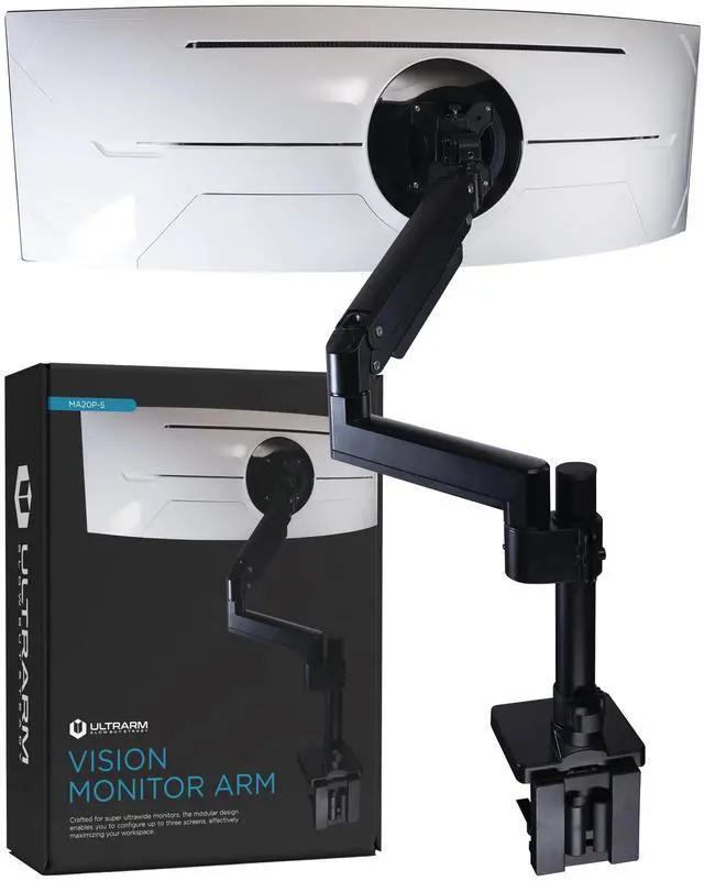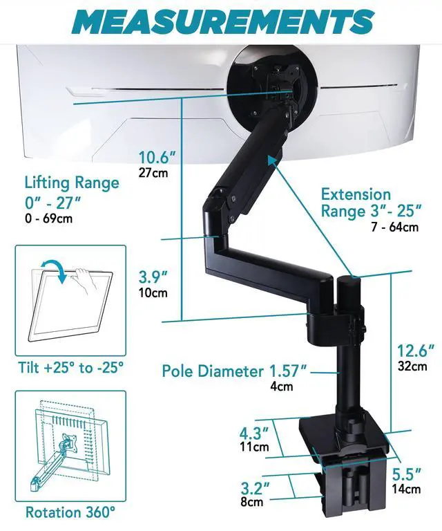 Tall Monitor Arm Desk Mount - ULTRARM premium heavy duty arm mount with built-in pnuematic spring system for perfect weight adjustment, clear cable management, and a quick-release VESA plate for simple monitor installation. ^^ Fits Ultra Wide Monitors - Holds one screen weighing up to 44 lbs. Fits ultrawide monitors up to 57" and downward compatible 49" to 24" flat, curved up to 1000R screens. The quick-release VESA bracket has 75x75mm and 100x100mm mounting capability. ^^ Fully Adjustable Monitor Arm - Vertical monitor mount offers flexible motion featuring +25 to -25 degrees tilt, 180 degrees swivel, 180 degrees rotating monitor, and 13 inches of smooth height adjustment with gas spring lift.
