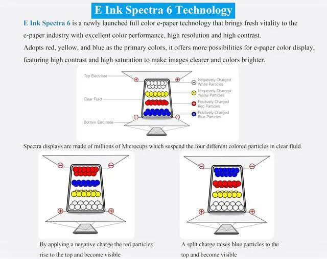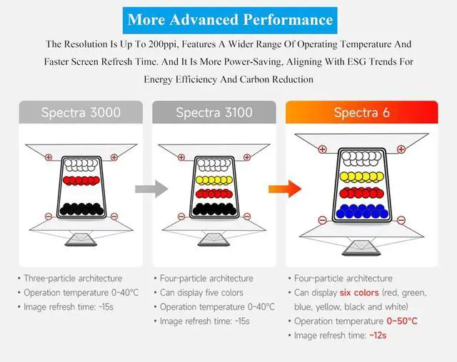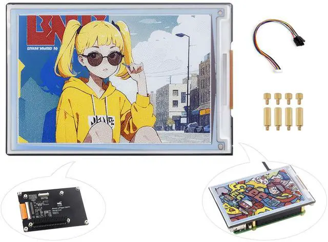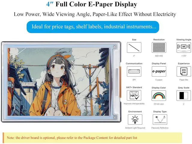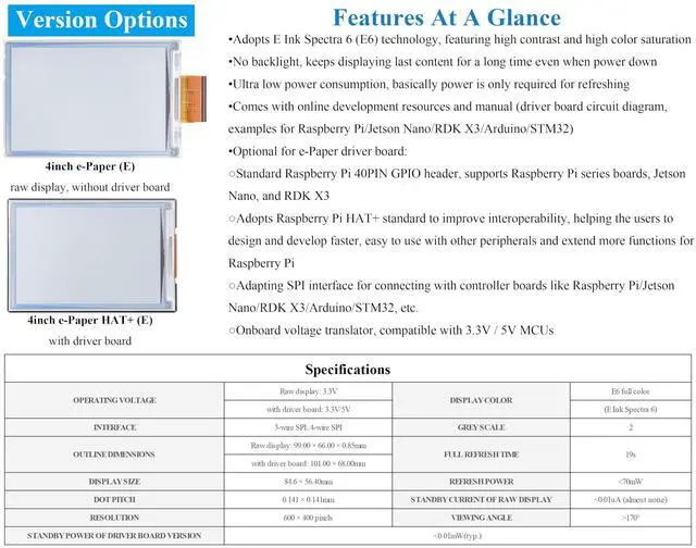 4inch E Ink Spectra 6 (E6) Full color E-Paper Display, 600400 Pixels, SPI Communication, with HAT+ Standard Driver Board. Adopts E Ink Spectra 6 (E6) technology, featuring high contrast and high color saturation. ^^ No backlight, keeps displaying last content for a long time even when power down. Ultra low power consumption, basically power is only required for refreshing. ^^ Compatible with Raspberry Pi 5/4B/3B+/3B/Zero/Zero W/Zero 2W/Pico/Pico W/Pico 2/Jetson Nano/RDK X3/withArduio/STM32. ^^ with Raspberry Pi HAT+ standard to improve interoperability, helping the users to design and develop faster, easy to use with other peripherals and extend more functions for Pi.
