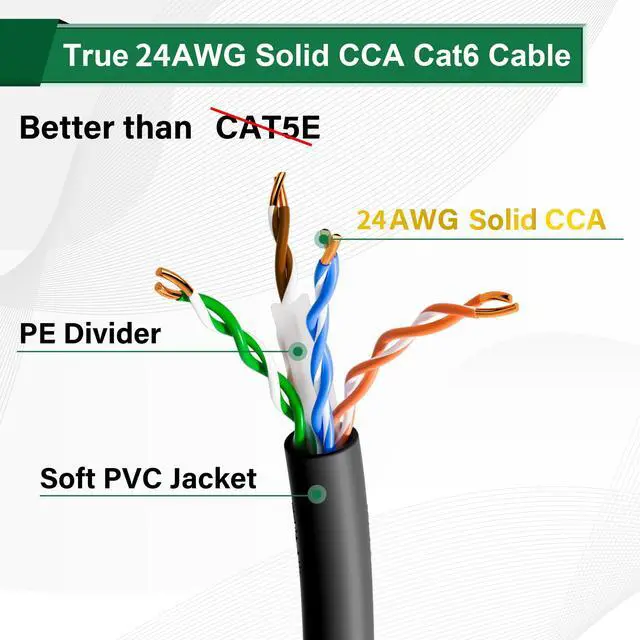Our Advantages: Very soft, flexible, smooth, untangled, and easy to bend-----Coming packaged in a hassle-free & easy-pull box-----The whole cable has runned "ft" count after every foot which makes measuring the cable easy-----The Insulation Peels Easily, even if you forget your cable strippers-----24 AWG CCA CONDUCTOR ^^