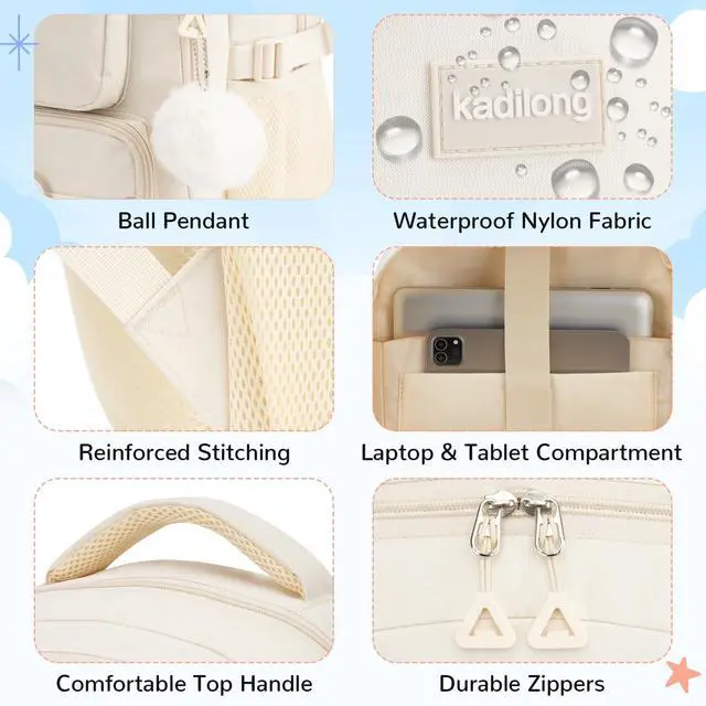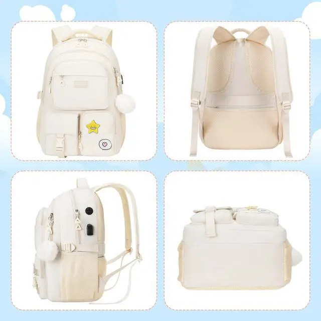 FeaturesStudent backpack aesthetic for gilrs and women, measuring 18.52" x 12.81" x 7.09". Made with durable water resistant oxford fabric. Breathable and adjustable shoulder straps relieve shoulder pressure to reduce discomfort. Along with fluffy ball key pendant and personality badge as gift makes the bags more cute. ^^ Well-Organized PocketsOne laptop compartment hold 17.3 Inch Laptop. Main compartments can accommodate lots of essentials like college, school supplies, travel, accessories, clothes, stationery, notebook, phone charger cable, Kindle devices etc. The front tool compartment also comes with multiple slots to provide roomy space for necessities.