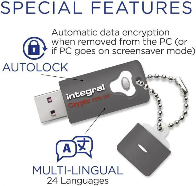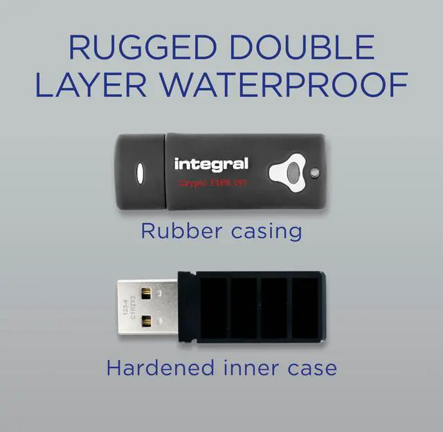 Certified to FIPS 197 A high-level information security standard approved by the U. S. government. ^^ Brute-Force Password Attack Protection Data is automatically erased after six failed access attempts. Both the data and encryption key are securely destroyed and the crypto drive is reset. ^^ Rugged Double-Layer Waterproof Design* Protects the crypto drive against knocks, drops, break-ins and submersion in water. The electronics are shielded by a hardened inner case, while the rubberized silicone outer casing provides an additional layer of protection. ^^ Auto-Lock The crypto drive automatically encrypts all data and locks when removed from a PC/Mac or when the screen saver or "computer lock" function is activated on the host device.