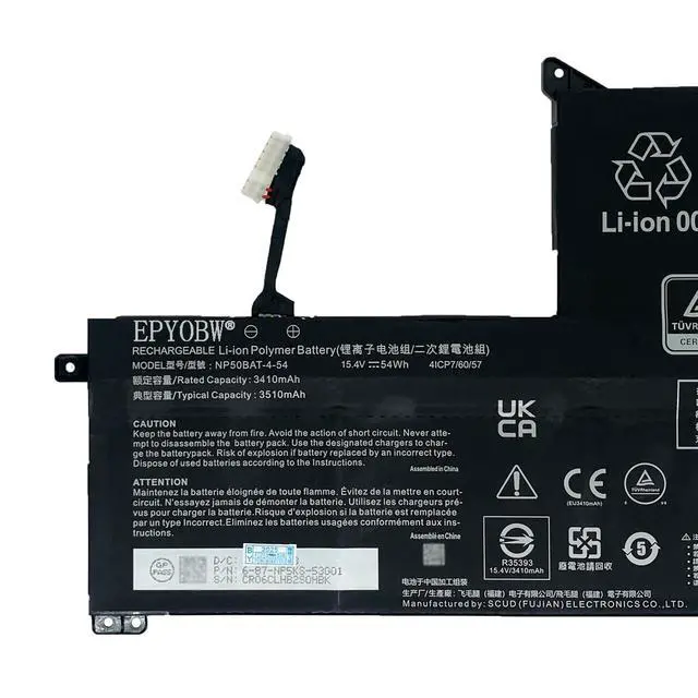 Condition: Brand New. ^^ Replace Part NumberNP50BAT-4-54 6-87-NPSKS-53G00 4ICP7/60/57 ^^ Compatible with Laptop ModelsFor Clevo AT22 NP70 X17 Series; For JiangXin X15 AT Series; For COLORFUL X17 AT X17 AT22 XS22 X1S XS22 Series; For SCHENKER XMG Focus 16 Series; For GIGABYTE G5 GE G5 KE G5 KF G7 KE Series. ^^ Purchase SkillsPlease open the back cover of the laptop before ordering and make sure that the original battery model is consistent with the listing. After getting the battery, please install the battery correctly, make sure that the battery connector is firmly connected to the laptop motherboard, and use the original charger to charge the laptop. Discharge the new battery to 5% (not 0%), then charge and cycle 3-95 times to wake up the new battery. ^^ EPYOBW PromiseAll EPYOBW's batteries are certificated by UL/CE/FCC/RoHS. Our batteries are tested by strict quality control standards to ensure that the capacity is true, stable current, low self-discharge. And we also have short circuit, overheat, and overload protections. We are confident in the performance of replacement batteries and professional service.