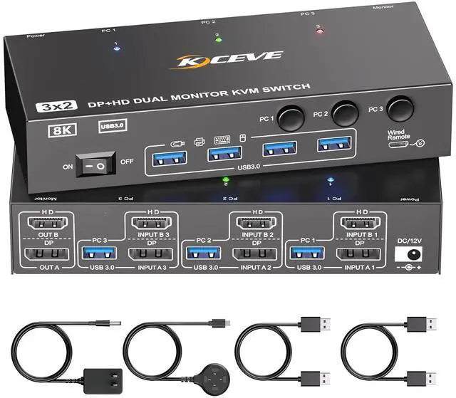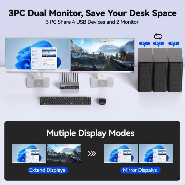 Dual Monitor KVM Switch for 3 PC This 2 monitor KVM switch allows you to control 3 computers by one set of (wired/wireless) keyboard mouse, share 2 monitors and 4 USB 3.0 devices. Support Copy & Extended Mode.