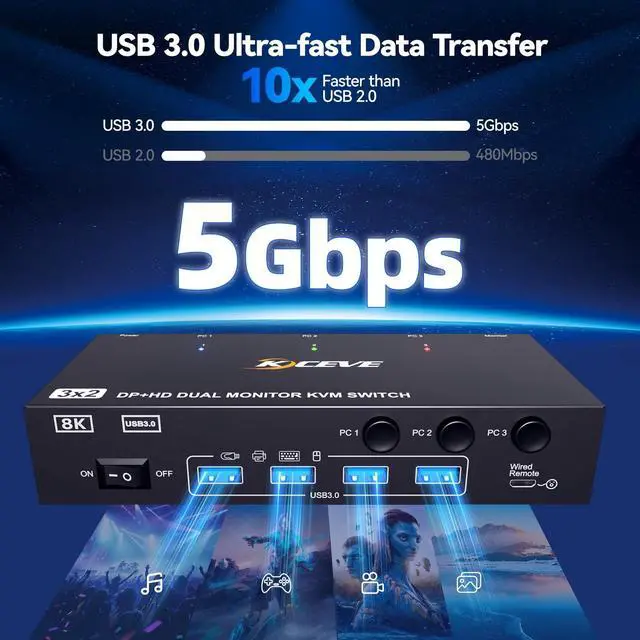 (Note: Please use HDMI 2.1 and DP 1.4 cables for a better experience, if the set distance allows, the length of cables more short more better. ) ^^ USB 3.0 KVM Switch3 computer KVM Switch with 4 USB 3.0 ports for peripheral USB devices such as keyboard, mouse, printer, etc. Supports ultra-fast USB 3.0 data transfer up to 5Gbps.