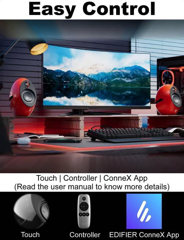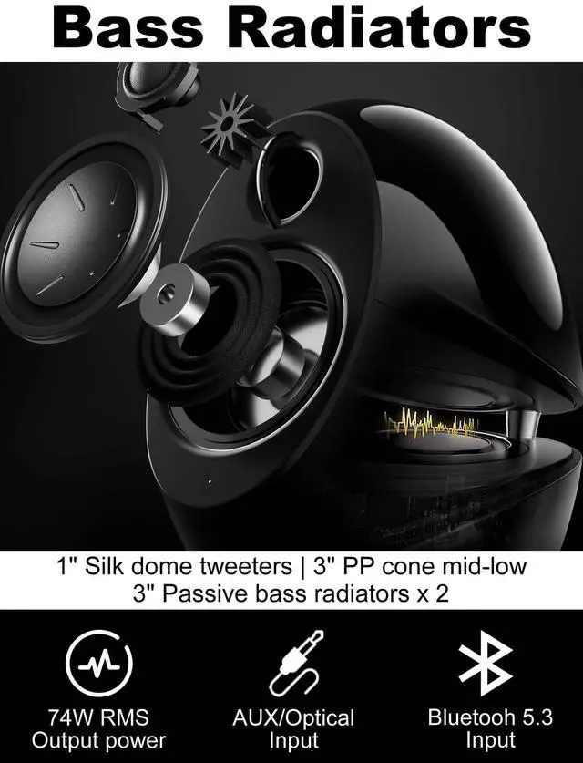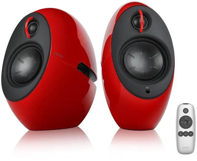 Unique Design - Edifier e25HD Lunar Eclipse artwork speakers awarded with smooth curves, distinct and high-gloss design ^^ 24-Bit Hi-Res Audio Decoding - Edifier e25HD 2.0 speakers with 1'' silk dome tweeters, 3'' full range drivers and LDAC codec for 74W RMS Hi-Res wireless audio and Hi-Res Audio ^^ Bass Boost - Dual 3 inch passive bass radiators to enhance low frequencies while minimizing resonance and distortion for frequency response of 50Hz-40kHz ^^ Easy Connectivity - Support 3.5 mm Aux, Optical Wired Connection for plug and play and Bluetooth 5.3 for wireless streaming with your cellphone or PC, great as monitor speakers, bookshelf speakers, computer speakers, turntable speakers ^^ Ease of Control - Conveniently reach all controls with a remote control, APP control of volume, playback, connection mode and power on/off.