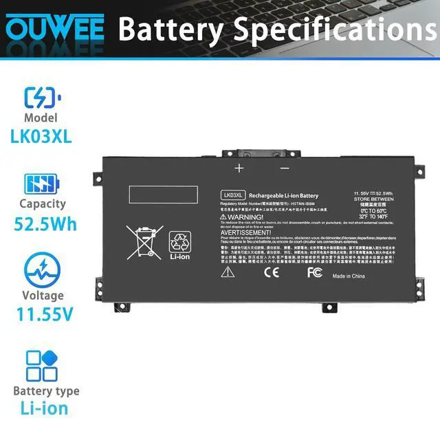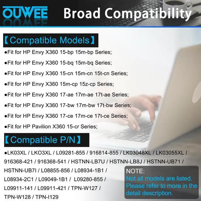 Replacement for Part Number: LK03XL / LKO3XL / L09281-855 / 916814-855 / LK03048XL / LK03055XL / 916368-421 / 916368-541 / HSTNN-LB7U / HSTNN-LB8J / HSTNN-UB71 / HSTNN-UB7I / L08855-856 / L08934-1B1 / L08934-2C1 / L09049-1B1 / L09280-855 / L09911-141 / L09911-421 / TPN-W127 / TPN-W128 / TPN-I1299. Compatible Models (use "Ctrl+F to find your model quickly")Fit for HP Envy X360 15-bp 15m-bp Series; Fit for HP Envy X360 15-bq 15m-bq Series; Fit for HP Envy X360 15-cn 15m-cn 15t-cn Series; Fit for HP Envy X360 15m-cp 15z-cp Series; Fit for HP Envy X360 17-ae 17m-ae 17t-ae Series; Fit for HP Envy X360 17-bw 17m-bw 17t-bw Series; Fit for HP Envy X360 17-ce 17m-ce 17t-ce Series; Fit for HP Pavilion X360 15-cr Series; Not all models are listed, please check the part number of your original battery. 10.