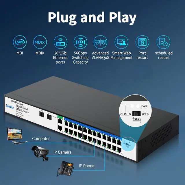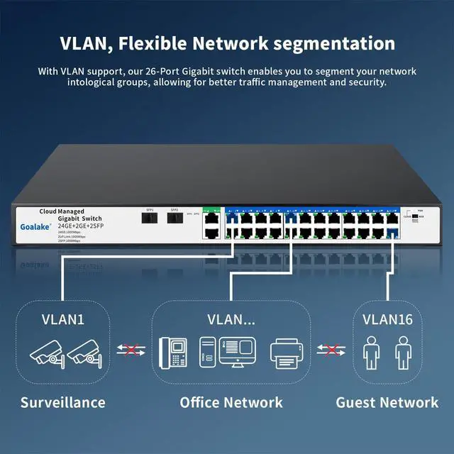 Web Interface: Easy Smart Management allows you to manage and configure your network effortlessly via a app or a comprehensive web interface and free software. The Goalake 26-Port Managed Gigabit Switch is an exceptional choice for any business seeking robust network management capabilities. ^^ Advanced Features for