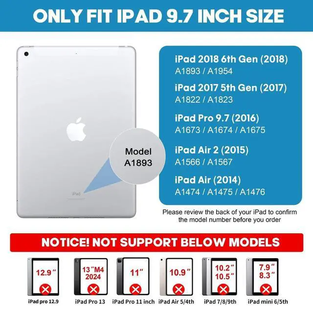 COMPATIBILITY - This iPad keyboard case is ONLY for 9.7 inch iPad 6th Gen 2018 (A1893/A1954), iPad 5th Gen 2017 (A1822/A1823), iPad Pro 9. 7 inch 2016 (A1673/A1674/A1675), iPad Air 2 (A1566/A1567) and iPad Air (A1474/A1475/A1476). Pls check the model number on your iPads back (iPad is not included) ^^ BRIGHT BACKLIGHT You have plenty of customization options with seven colors to choose from and three brightness levels. Backlit iPad keyboard case ensures you dont have any trouble while typing in low-lit environment. It looks as premium as the iPad itself and is available in three matching colors: black, silver, and rose gold. ^^ 360 ROTATION - Thanks to the 360 degree vertical rotation clamshell cover, you can have multiple viewing angles. Therefore, both your movie time and typing will have improved experience. This slim and lightweight keyboard case will turn the 9.7 inch iPad into a powerful laptop any time youd want it. You can display your work presentation watch your favorite show or read a new book while you enjoy your iPad a little more even when youre out and about! ^^ AUTO WAKE & SLEEP -The hardshell cover folds back to act as a stand and triggers the automatic sleep and wake function of your iPad, so it comes to life when you open the keyboard case cover. The keyboard is reasonably well-spaced with concave keys and it enables to access all ports and buttons easily. This protective case will ensure your iPad stays safe in the face of drops, knocks, or spills. ^^ 1 YEAR REPLACEMENT - We provide unlimited customer service support and tech support. Questions will be responded to within 12 working hours. It is a must have for anyone with a 9.7 inch iPad keyboard.