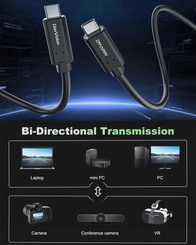 ^^ Unique Bi-Directional Transmission: Unlike traditional fiber optic USB-C cables that require fixed Host-to-Device direction, DavVision upgraded fiber optic USB cable supports true bi-directional transmission. Plug either end into your PC, camera, webcam, VR headset, or game console without worrying about orientation. Backward compatible with USB 3.0 and 2.0 for broader connectivity. ^^ Build in