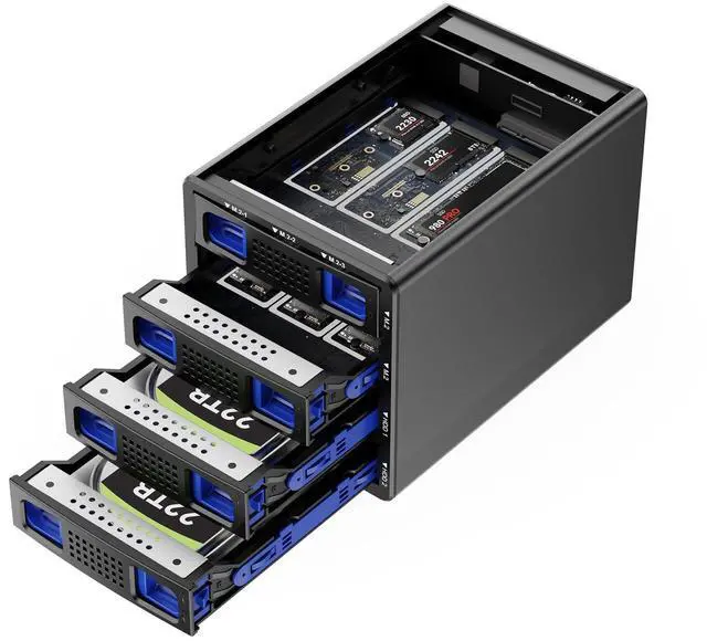 Innovative hybrid storageCENMATE's First Hybrid HDD+NVMe SSD Enclosure. The Hard Drive Enclosure can hold 2 SATA HDDs/SSDs and 6 M. 2 2230/42/60/80/110 NVMe SSDs. Maximum capacity of 22TB per drive and 8TB per M. 2 SSD. Expanding the capacity for users by a maximum of 90TB (Max 2*22TB HDD+6*8TB), combining the advantages of HDDs massive capacity and SSDs high-speed performance simultaneously! ^^ Up to 10GbpsUtilizes an advanced chip solution set and USB 3.2 Gen 2 protocols, full load read rate at 200-300MB/S. ^^ No heatThis NVMe enclosure built in Aluminum-Alloy materials and 2 inch Silent Fans.