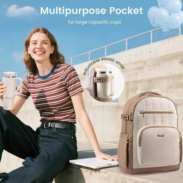 Size: 13L 19.5H 8.5D. ^^ Dual Giant Water Bottle Pockets Adjustable elastic strap, help hold bottles in place. Securely fit your massive Stanley Cup or favorite water tumbler in both upgraded side pockets. Stay hydrated effortlessly on commutes or non-stop teaching/working/studying days! ^^ Anti-theft & Laptop Protection Pickpocket-Proof! The hidden back pocket and front pocket guard valuables against pickpockets. The built-in padded compartment shields your electronics from bumps and scrapes, ensuring the safety of your items. ^^ Travel Ready Airport Approved! Slide it onto your suitcase with the luggage pass-through strap for easy travel. Travel backpack carry on flight approved, fits great under the seat on the plane! Perfect for daily commutes and travel. ^^ Comfortable & Durable & Waterproof Travel & Commute in Comfort. Thick Padded, breathable shoulder straps reduce pressure and make heavy loads feel lightereven after hours learning/teaching or dashing between meetings. Made with high-quality, wear-resistant fabric that's water-resistant (protects against spills and light rain). ^^ Practical Gifts & Quality warranty Perfect for teachers, nurses, college major, travelers, andprofessional women A seriously thoughtful gift for your wife, mom, sister, best friend, or daughter.
