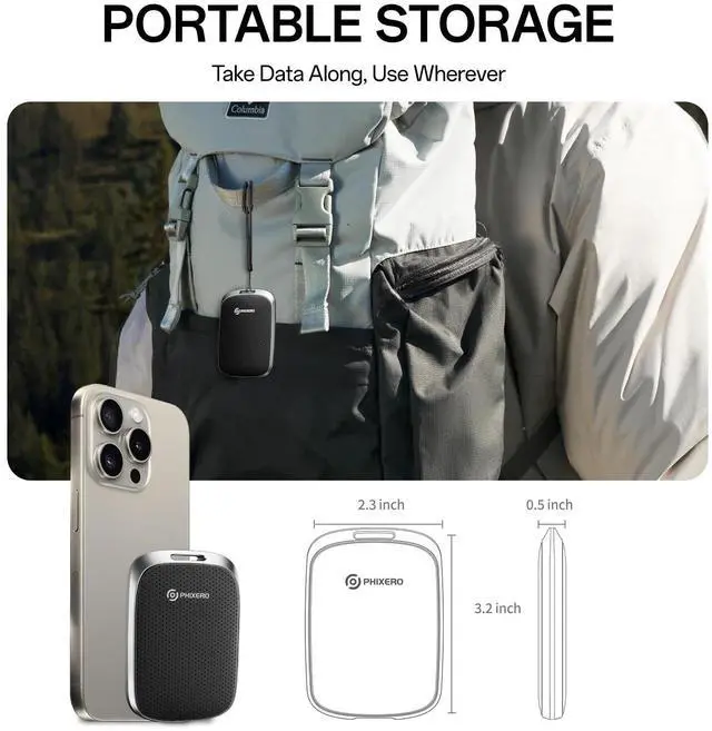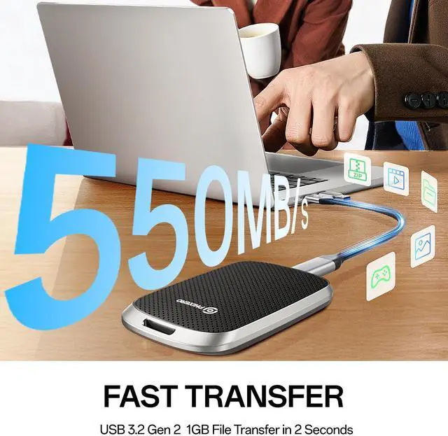Extremely fast transfer speedP5PLUS External SSD supports continuous read speed of 550MB/s and write speed of 500MB/s. Don't waste a second waiting, transfer all heavy files in seconds, improve the efficiency of transferring/loading videos, photos, files and games. It allows you to get more things done in a short time. ^^ Sturdy and PortablePHIXERO P5PLUS External Solid State Drive adopts anti-drop, anti-vibration, anti-dust, and solid one-piece aluminum alloy frame with high strength and durability, making this portable hard drive keep the drive almost silent when running. The mini design makes it very convenient for you to carry and use.