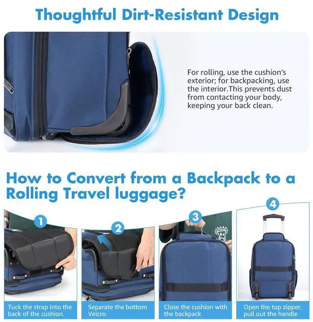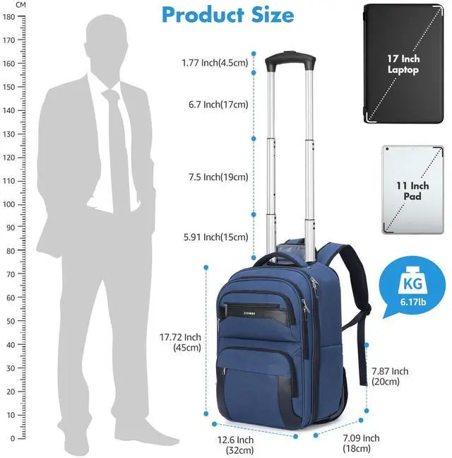 ^^ FLIGHT FRIENDLY SIZE: This travel backpack with wheels opens 180 for quick security checks, and its dimensions of 12.6 '' L 7.09 '' W 17.72 '' H meet the requirements of most airlines, ensuring it fits easily in overhead compartments. It's perfect for short trips or business travel, making it an ideal companion for your journeys ^^