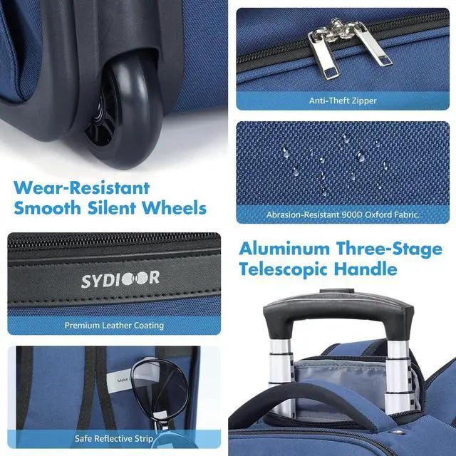 DURABLE MATERIAL AND SAFETY DESIGN: This under seat luggage with wheels is made from durable, 900D Oxford fabric and features a safety reflective strip for nighttime visibility. It has two embedded silent wheels suitable for stairs or uneven terrain, and a 3-level telescopic handle that adjusts to different heights ^^ 3-IN-1