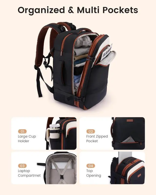 Expansive Capacity & Smart Organization: This versatile backpack has an expandable main compartment to adjust capacity for daily commutes or short trips, making it a practical travel essentials. It features multiple handy pockets, a waterproof section and padded laptop sleeve, working well as everyday laptop backpack and reliable carry on backpack. Switch easily between a tidy daily bag and roomy travel pack, keeping your belongings neat and secure on the go. ^^ With 2