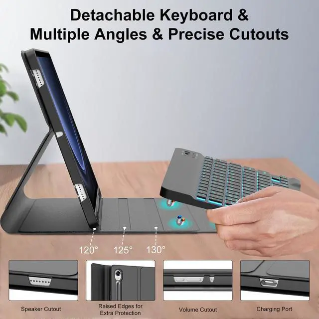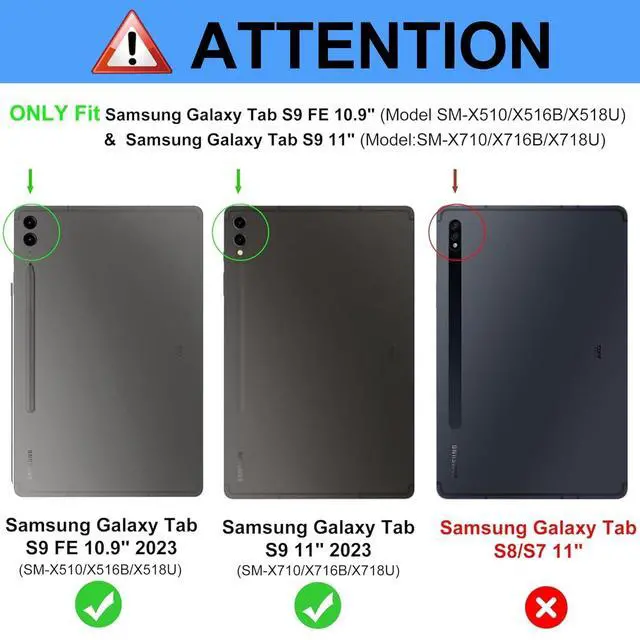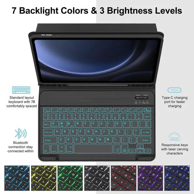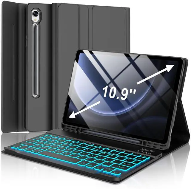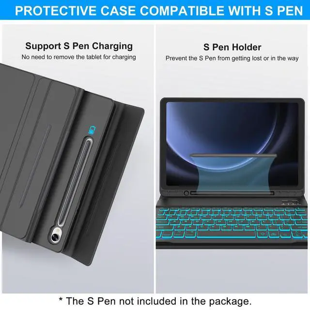 Galaxy Tab S9 FE Case with Keyboard, Detachable Wireless Bluetooth Keyboard, Smart Folio Cover with S Pen Holder for Samsung Galaxy Tab S9 FE 10.9 /S9 11 inch, 7 Color Backlit, Auto Sleep/Wake, BlackDescription: - Slim, sturdy and attractive design. The tablet fits snugly into Samsung Tab S9 FE case with keyboard and provide sufficient protections for daily use. - samsung s9 case and real, quiet Galaxy Tab S9 keyboard support 3 use modes - Typing, Viewing, Reading - giving you amazing versatility. It allows you to prop the tablet up for watching videos. - All your tablet needs in one tool. The S9 FE tablet case with keyboard takes mobile computing to a new level. Now you can enjoy laptop-like typing anywhere you take your tablet. Its slim design make it a joy to use anywhere, anytime. -Accurately typing on the Samsung Galaxy Tab S9 FE keyboard even in a dark room is ergonomic keys.