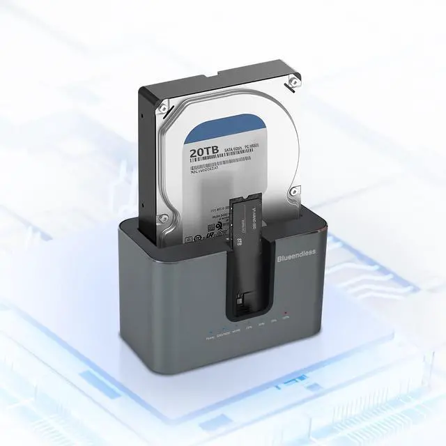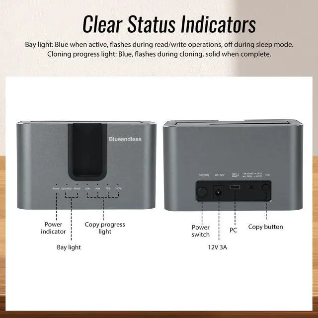 Ultra-Fast Data Transfer: NVMe drives support up to 10Gbps transfer speeds, and SATA drives reach 6Gbps. Significantly reduce transfer times for large files between storage devices and computer systems, enabling rapid file migration. Clear status indicators: The drive bay light illuminates blue, flashes during read/write operations, and turns off during sleep mode. The cloning progress light glows blue, flashes during cloning, and remains steady upon completion