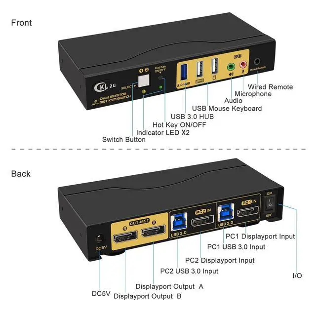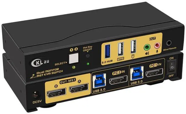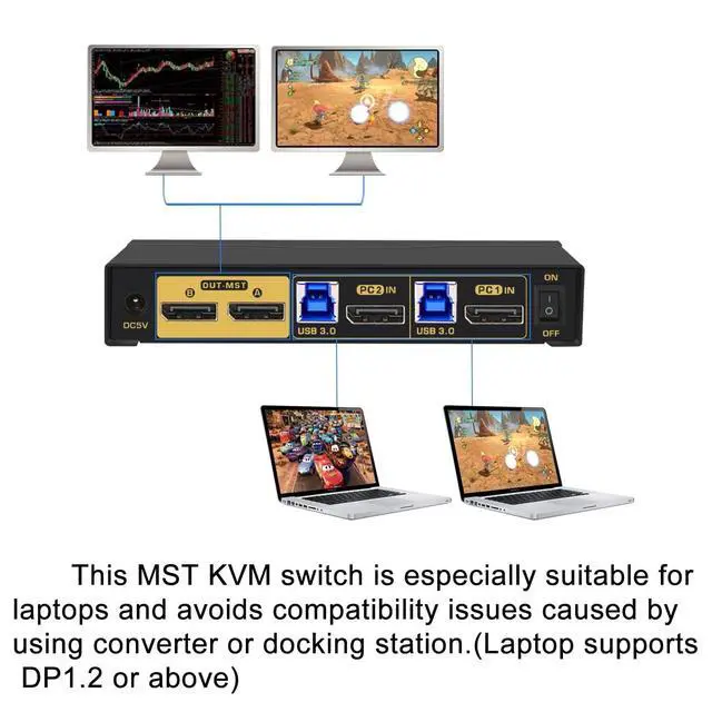 MST KVM Dual Monitor: MST 1 Displayport in, 2 Displayport out. This KVM switch can connect 2 PCs/laptops, it is especially suited for the laptop with a Displayport port output to use dual monitors, and it will avoid compatibility issues caused by using an adapter/docking station. (you should confirm your laptop supports DP 1.2 output) ^^ 2. KVM Switch 2 Monitors 2
