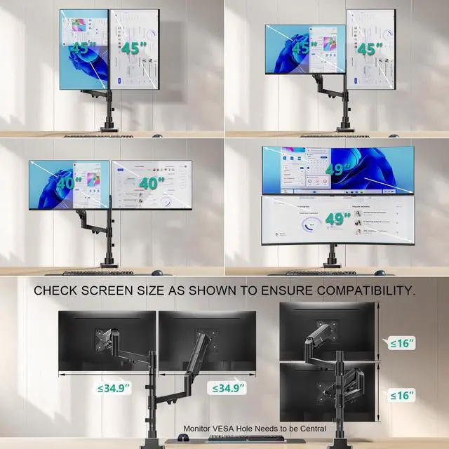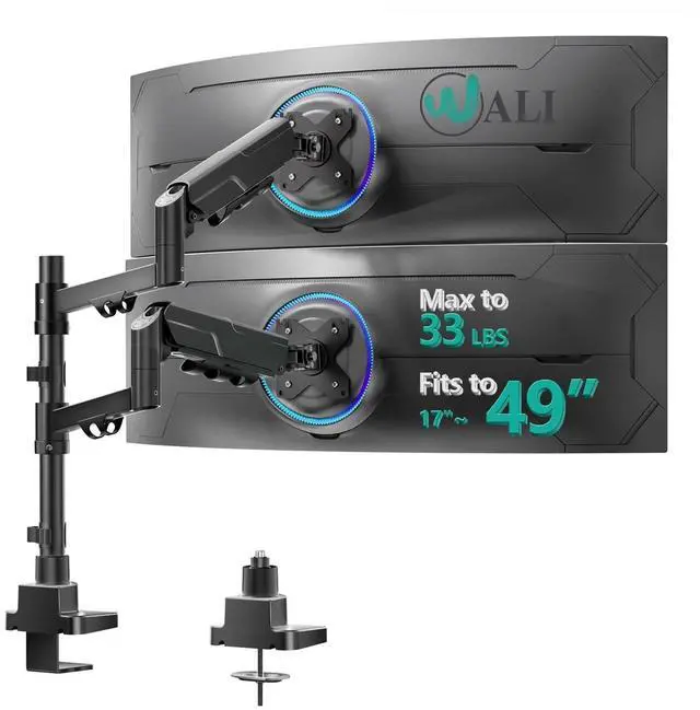 Fit up to 49" & 33lbs MonitorsWALI vertical dual monitor stand supports most QLED, OLED, LED flat, and curved computer monitors ranging from 17'' to 49'' with VESA patterns from 75x75mm to 100x100mm. Compatible with major brands like Samsung and LG, its heavy-duty aluminum construction ensures rock-solid stability and supports up to 33 lbs.