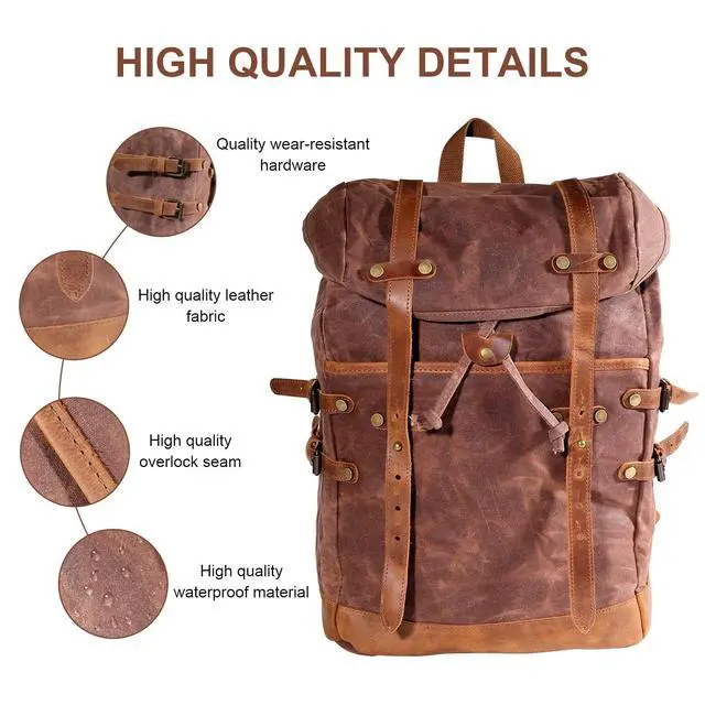 ^^ Premium Quality Material: This backpack is made of waterproof durable canvas and top quality genuine crazy horse leather trim. The premium quality ensure the long lasting durability. The high density canvas is made of pure cotton, its strong, hard-wearing, scratch-resistant. The crazy horse leather is made of high-end top layer cowhide material, with a thickness of 2.5 mm, which is solid and durable, and the quality solid hardware wont gather rust easily.